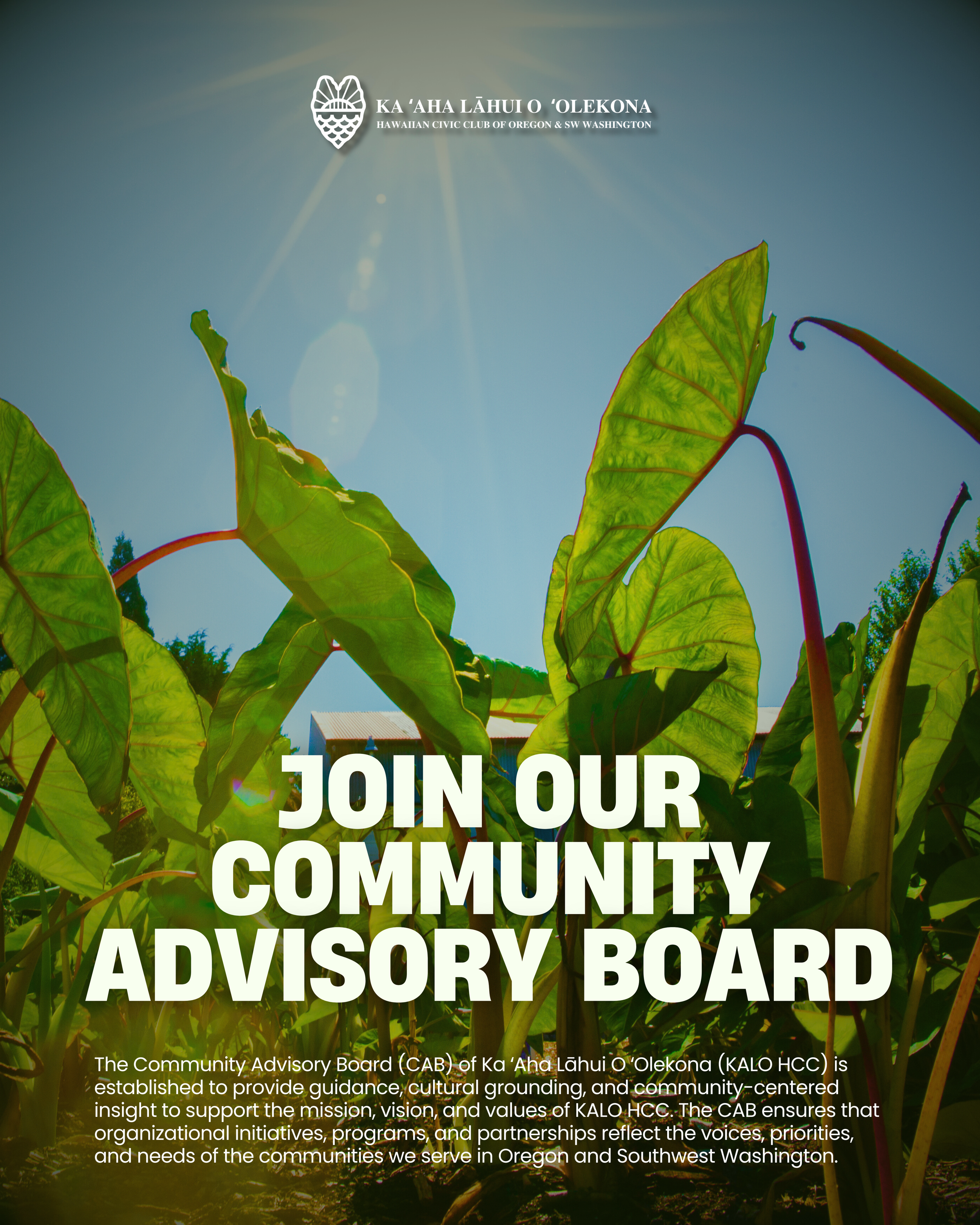 The Community Advisory Board (CAB) of Ka ʻAha Lāhui O ʻOlekona (KALO HCC) is established to provide guidance, cultural grounding, and community-centered insight to support the mission, vision, and values of KALO HCC. The CAB ensures that organizational initiatives, programs, and partnerships reflect the voices, priorities, and needs of the communities we serve in Oregon and Southwest Washington.
