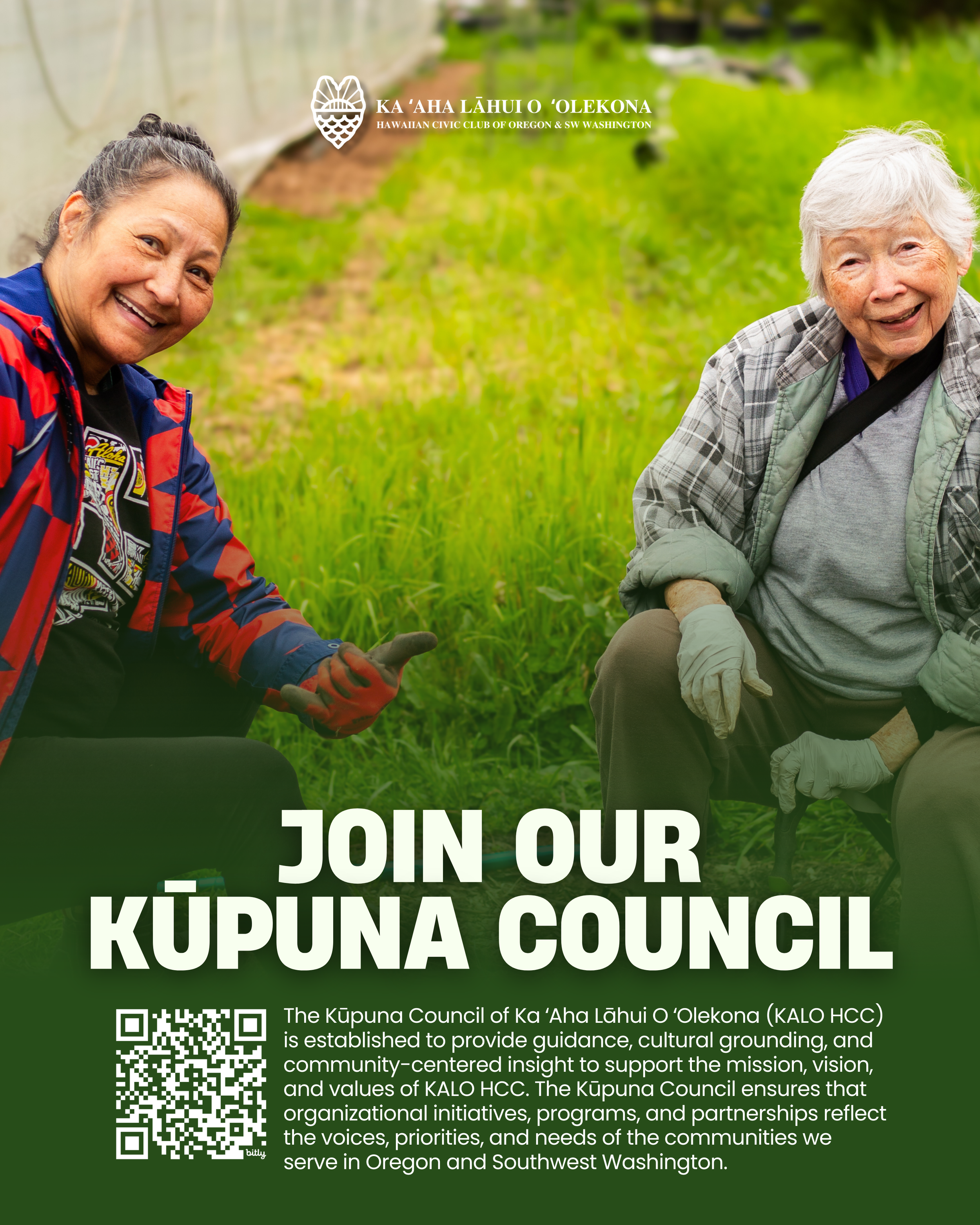 The Kūpuna Council of Ka ʻAha Lāhui O ʻOlekona (KALO HCC) is established to provide guidance, cultural grounding, and community-centered insight to support the mission, vision, and values of KALO HCC. The Kūpuna Council ensures that organizational initiatives, programs, and partnerships reflect the voices, priorities, and needs of the communities we serve in Oregon and Southwest Washington.